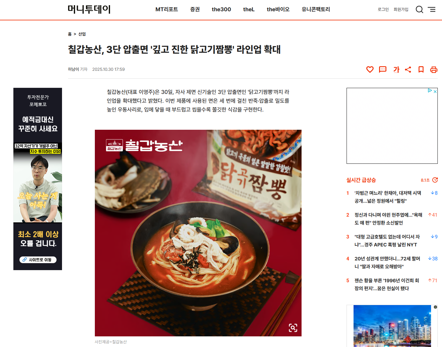 3단 압출면 '깊고 진한 닭고기짬뽕' 라인업 확대 2025-10-31 |