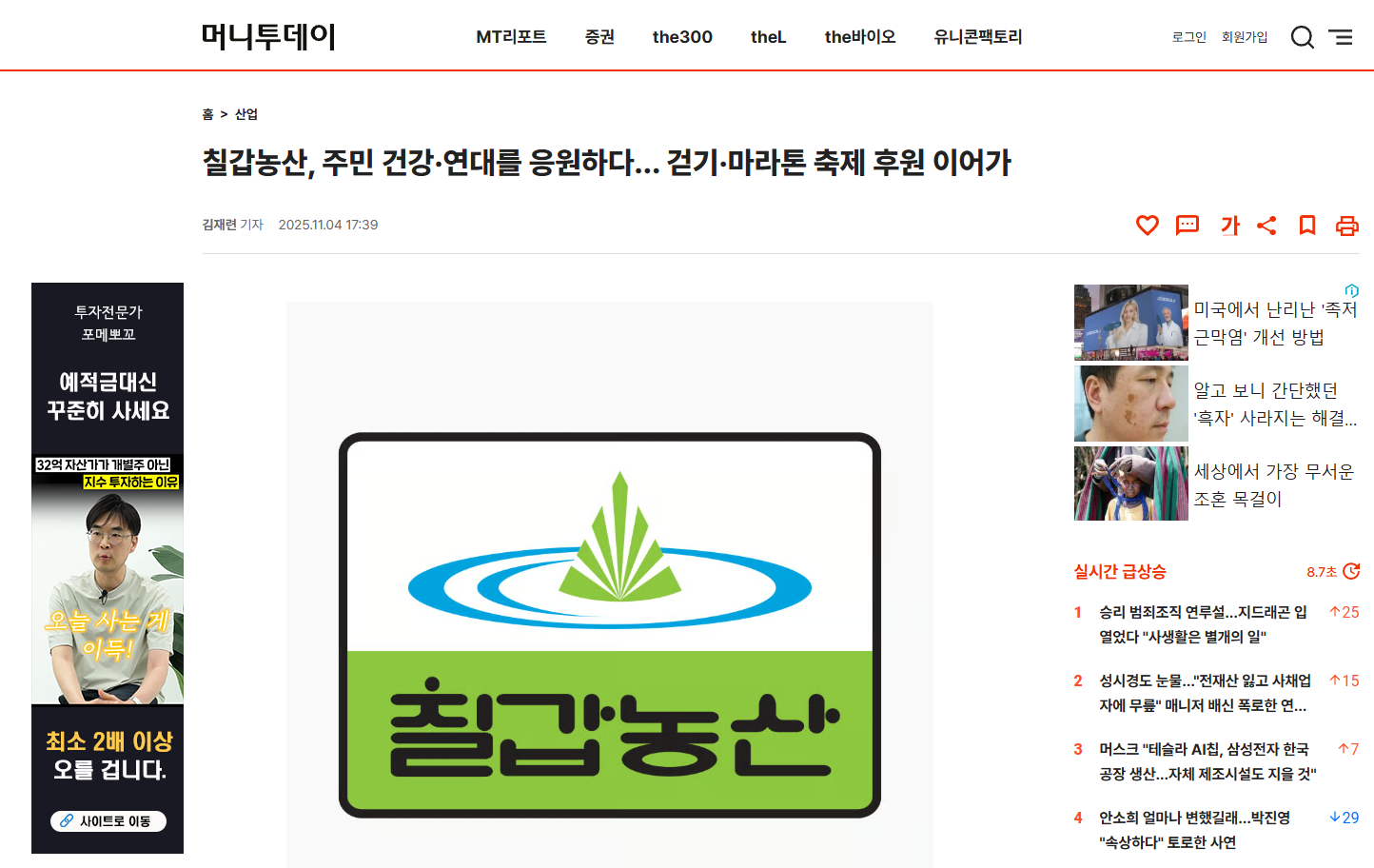 칠갑농산(대표 이영주)은 지역과 함께하는 사회공헌 활동의 하나로, 지난 10월 26일 청양군체육회장기 전국마라톤대회 및 군민건강걷기대회, 11월 1일 열린 '제19회 고양바람누리길걷기축제', 그리고 11월 8일 개최되는 '2025 고양 호롱불 나이트워크' 행사에 협찬 참여했다고 밝혔다.