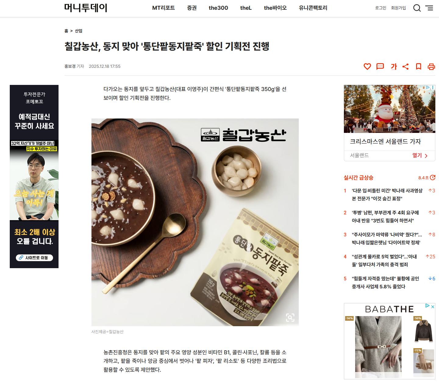 동지 맞아 '통단팥동지팥죽' 할인 기획전 진행 2025-12-16 |